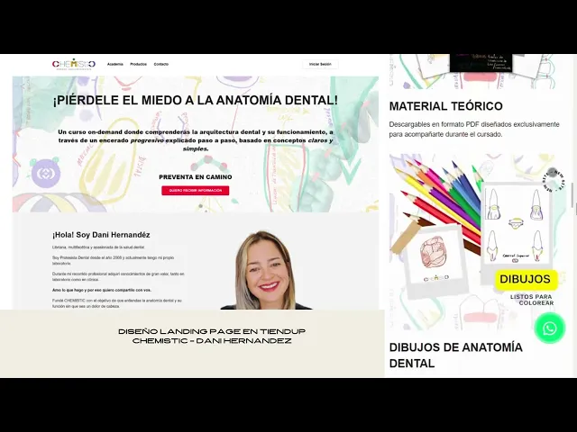 Dani ya tenía su tienda física en Tiendup y buscaba aprovechar más la plataforma para lanzar su curso de anatomía dental. Le propuse sumar una landing específica para el curso y rediseñar el home, integrando academia + tienda en un mismo espacio. Me ocupé del diseño visual, banners, mockups, copy, SEO y estructura narrativa, logrando una solución clara y profesional que potencia tanto sus productos físicos como su propuesta educativa.